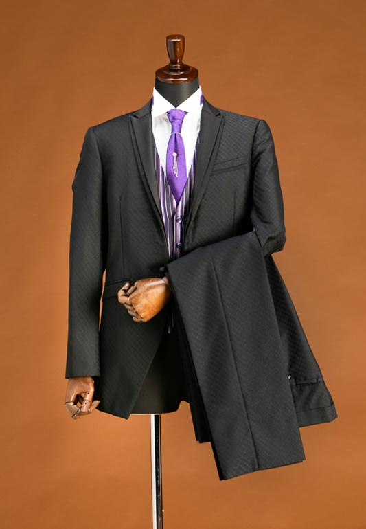- 紫の差し色が可愛い!ブラックタキシードです。ジャケットを着たまま一日をお過ごし頂いてもいいですし披露宴の際にジャケットを脱いで印象を変えるのもおすすめです。
