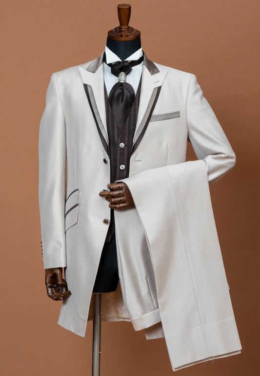 - 上品な光沢を放ち、柔らかく輝くロングタキシード。ラペル部分はグラデーションデザインにステッチの入った細部までこだわり抜いたデザイン。ベストとタイがダークブランで引き締まった印象もありながらベージュならではの優しさのあるお色味は多くのお客様にお召易く、挙式やパーティーシーンなど幅広いシーンにお勧めの1着です。