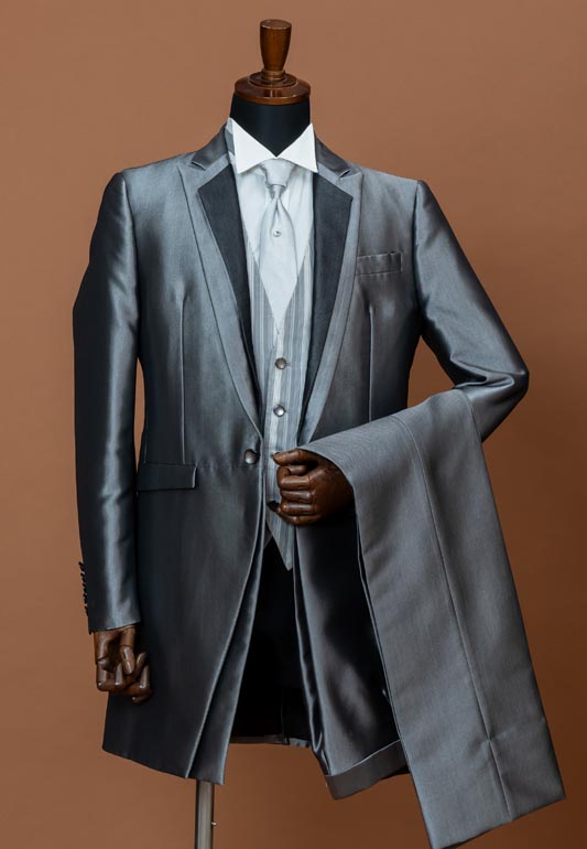 - メタリックなチャコールグレーのタキシード。ラペルとジャケットのレイヤードデザインがスタイリッシュでスマートな印象の1着。カジュアルなシーンにもフォーマルなシーンにも合わせやすいお色味です。
