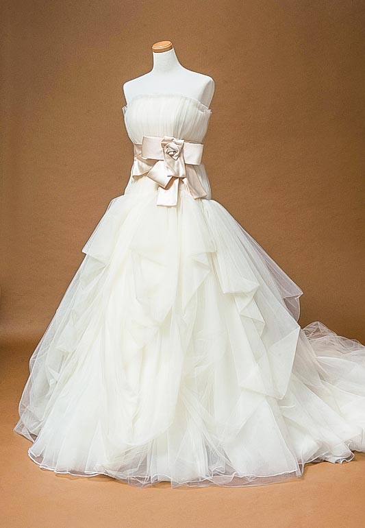 - ウエストに施されたリボンが可愛い、透け感のあるチュール素材が魅力的なAラインのウエディングドレス。すっきりとしたトップスとボリュームのあるスカートのメリハリが女性らしい印象になります。