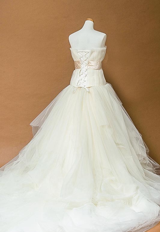 - 全体的に柔らかいチュールがふんだんに使われ、上半身の部分やスカートにもタックが施されているので、遠目から見た時にはフワフワしたボリュームがある華やかな雰囲気に。また、近くで見た時には繊細なタックが細やかなデザインを感じさせる1着となっております。