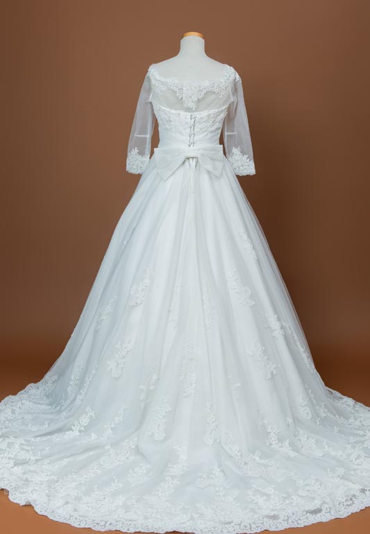 - ボリュームが充分にあるAラインドレス。こちらのドレスはトップス部分のブラウスが取り外し可能なドレスです。 2通りの雰囲気を楽しむことができるのでお色直しをしない方にもおすすめの1着。