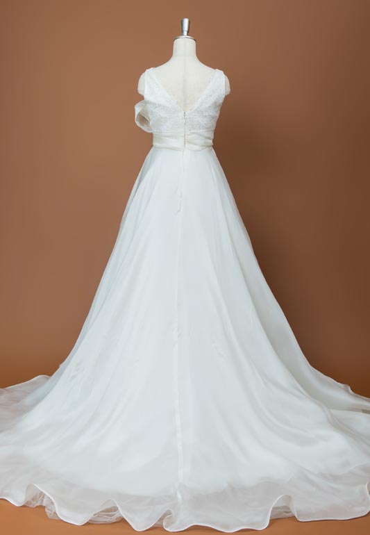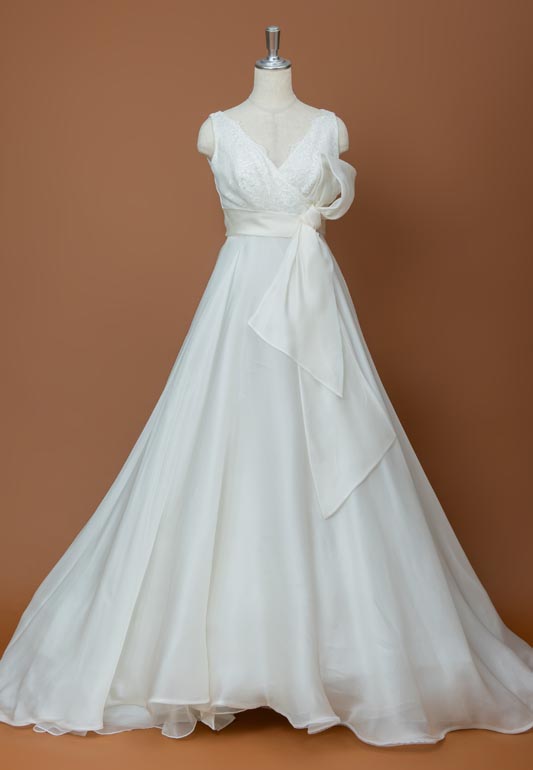 - 特徴的な大きなリボンは、縦のラインを強調しスタイルアップ効果も。エレガントでありながら、透明感のある素材とデザインで大人可愛い印象にしたい花嫁様におすすめの1着です。