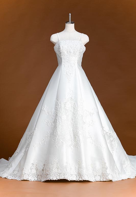 - ご親族様ウケ間違いなし、誰からも好かれるAラインドレスです。王道ドレスといえばミカド素材のカットワークドレス。たっぷりとレースが施されている清楚なドレスです。女性らしさのある上品な草花のレースが特徴。レースの上にパールビーズがあしらわれ、細いストラップがドレスに付いており、ドレスの着心地に安定感もプラスされます。