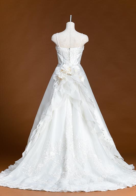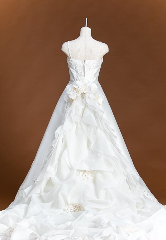 - そして、後ろ姿はさらに豪華。トレーンとお花は取り外しが簡単に出来、付けるとグッと可愛らしさが増してトレーンも長くなります。トレーンを外すと、オーガンジーの上にレースがあしらってある上品なドレスに早変わりできます。