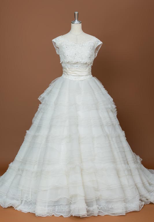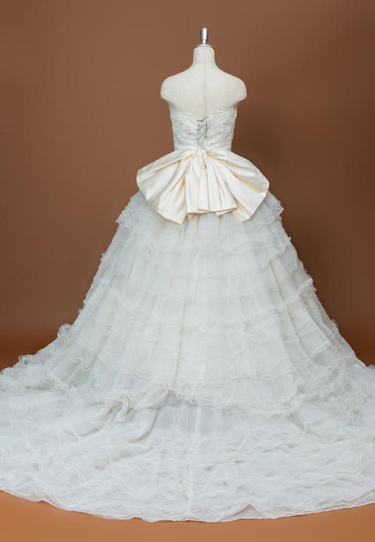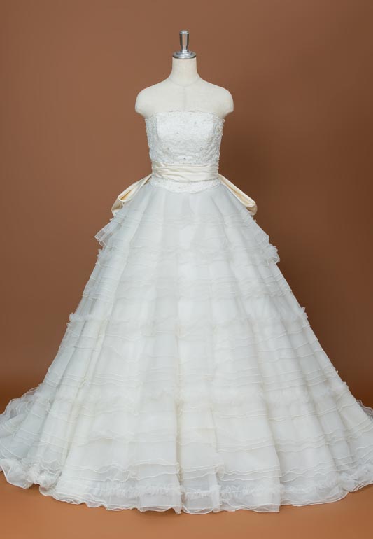 フレアたっぷりのティアードスカートがちょっと大人めでフェミニンな印象のプリンセスラインドレス