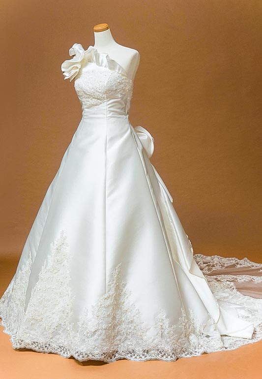 - ミカド素材は、ウェディングドレスの最高級素材と言われており、光沢があってハリ感が強い為、立体的なフォルムを表現するのに適しています。フリルワンショルダーも取り外しが可能なので、すっきりとビスチェスタイルでお召し頂くこともでき、華やかなワンショルダーとしてもお召し頂くことができます。