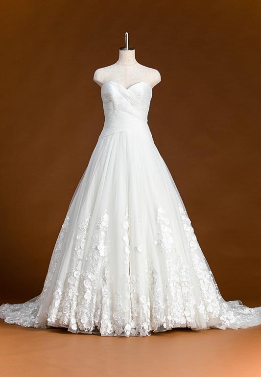 - シンプルな大人プリンセスのAラインドレスです。エアリー感のある立体的な花柄レースが特徴の1着。トップス部分はとてもシンプルなのですが、タッキングされているので美しい陰影を作りだしてくれるデザインとなっております。