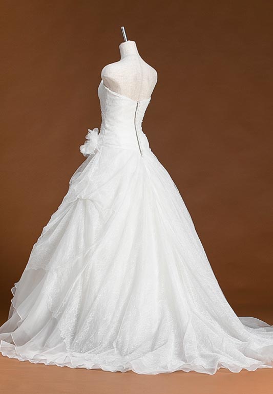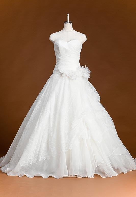 - デコルテが綺麗に見えるハートカットのドレス。レースをふんだんに使用した7号サイズの大人の女性にふさわしい気品あふれる1着です。通常のレースと違い、ベールやトレーンに使用されるレースをふんだんに使用しております。より柔らかい雰囲気でお召頂くならば、ドレス専用の付属のお花があるのでそちらを付けて頂くのもおすすめです。