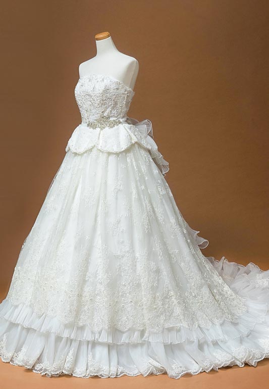 - ぺプラムのデザインが珍しい!ドレス全体にレースが施された豪華な7号から11号のプリンセスラインのドレス。こちらのドレスは何よりもウエスト部分のぺプラムが特徴です。