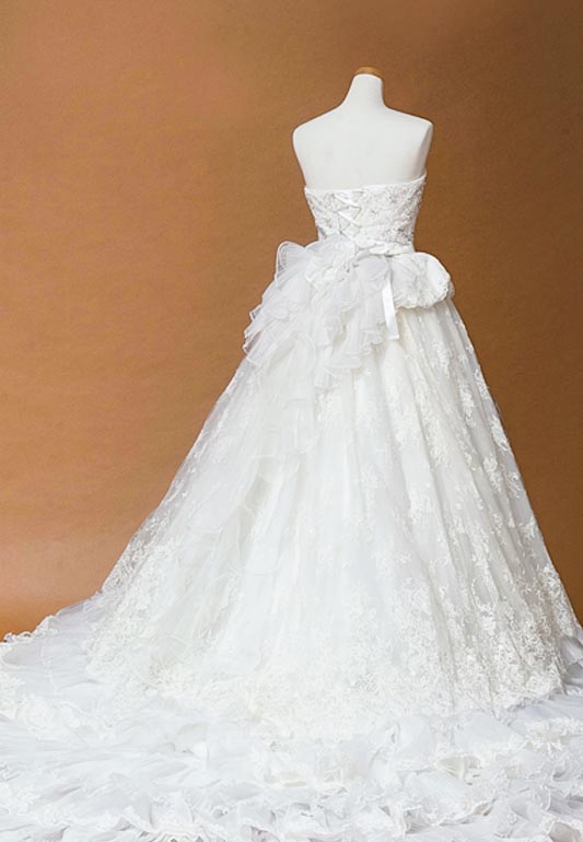 - バックスタイルもボリュームのあるトレーンがついた贅沢なデザインになっておりますので、王道なティアラでお召し頂くのもオススメです。