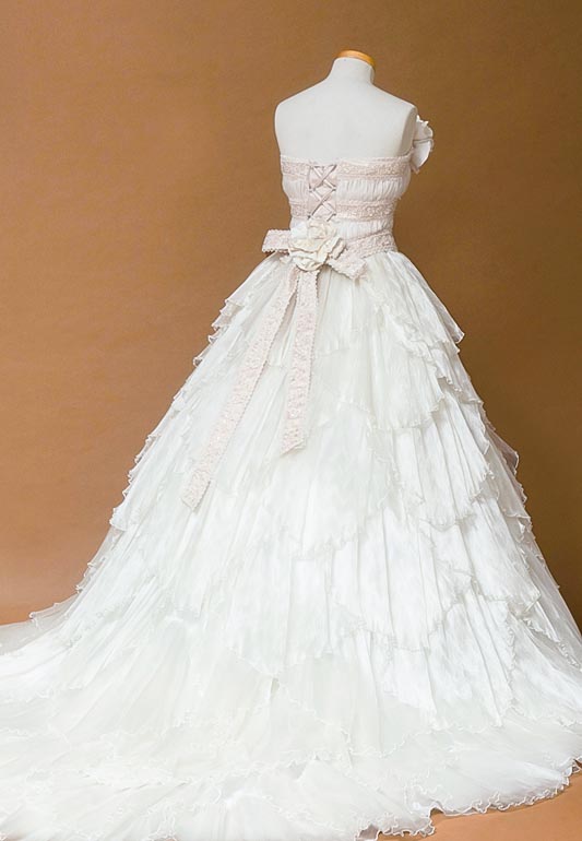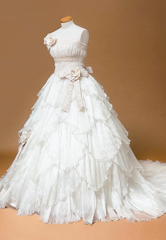 - 上半身のビスチェ部分をコンパクトにまとめ、ウエストから裾へ広がる大胆なフォルムが魅力的な一着です。また、スカートの部分は軽く透明感のあるオーガンジーと重厚感のあるミカドカットワーク。プリーツとの質感が異なる素材のコントラストは遠くから見ても写真映えします。