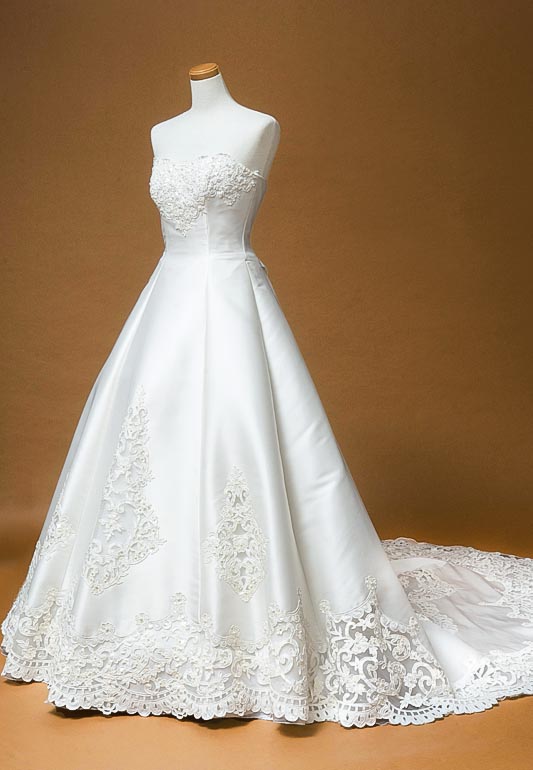 - 付属の小物で印象を変えられる!変幻自在の王道のAラインウエディングドレス。生地感もハリのある素材を使用している為、美しいシルエットをキープし、スカートのカットワークにコード刺繍とスパンコール刺繍を施したゴージャスな1着です。
