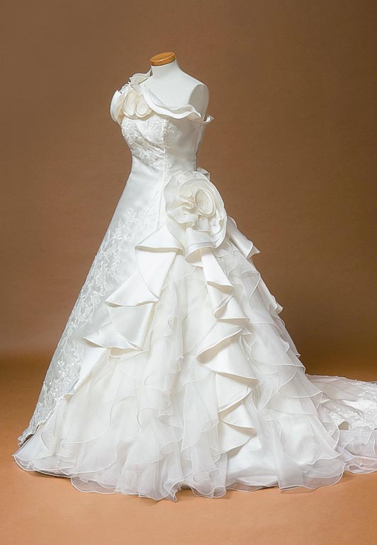 - 王道なミカド素材のドレスではありますが、一味も二味もこだわって作られているので、特別なドレスになること間違いなしです。また、流れるような草花の刺繍から立体的なお花が咲くようにデザインされているのも、繊細さや気品も感じられる1着。ワンショルダーのフリルが取り外し可能でセットで付いているので、挙式と披露宴で雰囲気を変えてお過ごし頂くこともできます。