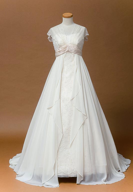 - ナチュラルな雰囲気の7-9号サイズのエンパイアドレスです。こちらは、エンパイアラインという胸下切り替えデザインのドレスなのでウエスト切り替えとは違い、脚長効果抜群。レースとジョーゼット生地を使用しており、柔らかい雰囲気でお召し頂けます。