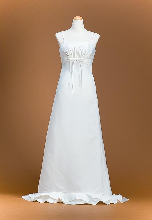 - ハイウエストなデザインでスタイルアップ効果抜群、エンパイアラインのシンプルなデザインのウェディングドレスです。オフホワイトのドレスなので、日本人の花嫁にはピッタリのお色味といえます。エンパイアラインとは胸下に切り替えがあり、裾に向かって直線的に広がったシルエットのデザインの事。