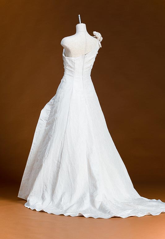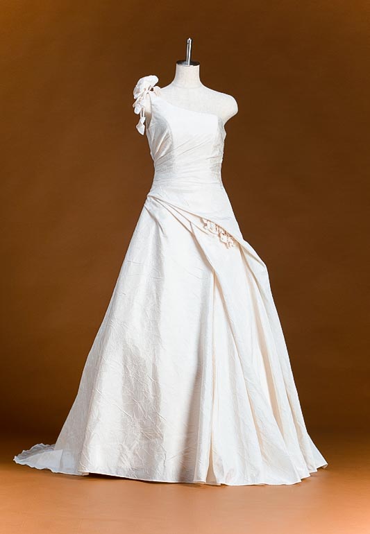 - ナチュラルな雰囲気漂う大人のAライン。ワッシャータフタという珍しい生地を使用した、ワンショルダーデザインのドレスです。タフタとは薄くて軽い素材でハリのある硬めの質感を持っており、上品な艶とドレープ感が特徴的な生地になります。その生地にあえて洗いざらしのようなシワ感を出す加工を施し、ナチュラルな風合いを演出しています。サテンのようなドレスらしい光沢がある生地も素敵ですが、華やかさよりも少し落ち着いた雰囲気がお好きな方にオススメのドレスとなります。