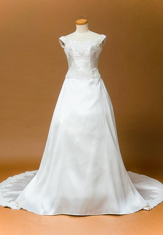 - 身頃とオフショルダーの部分にしっかりとコードレースが施されているので、遠くからでも、また座った時にも写真映えするデザインです。パールやアンティークの刺繍もより上品さを醸し出し、自然光も取り入れてくれるため、お顔回りを明るくしてくれるのも嬉しいポイント。スカートは身頃のコードレースをより引き立たせる為、光沢のあるシンプルなデザイン。