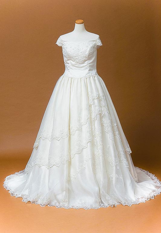 - 可愛らしさだけでなくロマンティックな雰囲気を演出してくれるデザインです。こちらのドレスはオフショルダーになっているのでビスチェタイプに比べると、よりフェミニンな印象になります。ティアードスカートになっているドレスは、それだけで十分華やかになるので、合せる小物はシンプルにまとめるのがオススメ。後ろのトレーンも長すぎないので、360度どこからみても美しいドレスです。